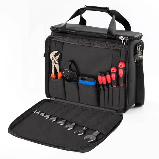 İçerisinde bulundurduğu çok sayıda farklı ebatlarda bölme, cep ve tam olarak açılan çift fermuarlı yapısıyla ihtiyacınız olan tüm aletlere kolaylıkla ulaşmanızı sağlayan eşsiz bir organizatördür.
